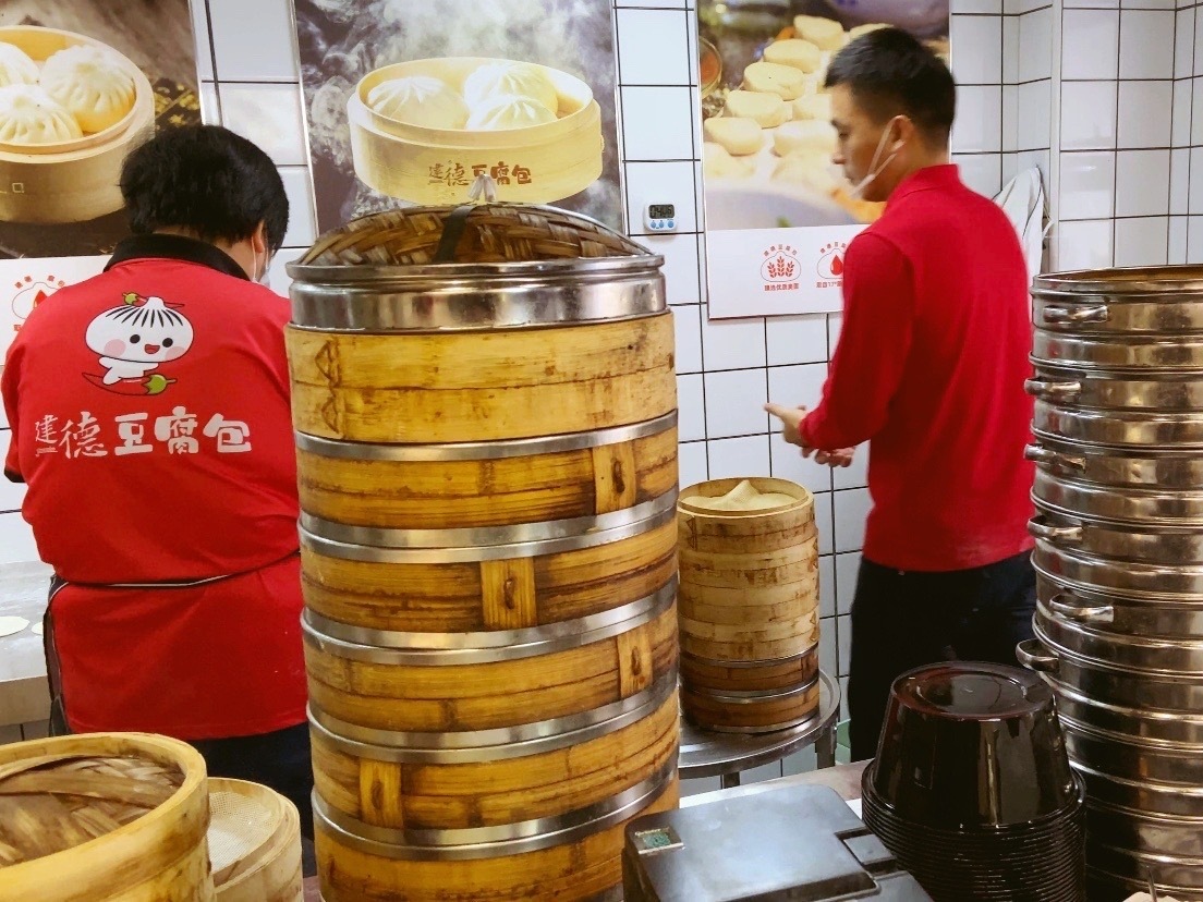 上海首家建德豆腐包店坐落在武定西路1180号,冬天一到,进门的顾客眼镜的雾气还来不及擦又袭来一股豆腐包出锅的热气。