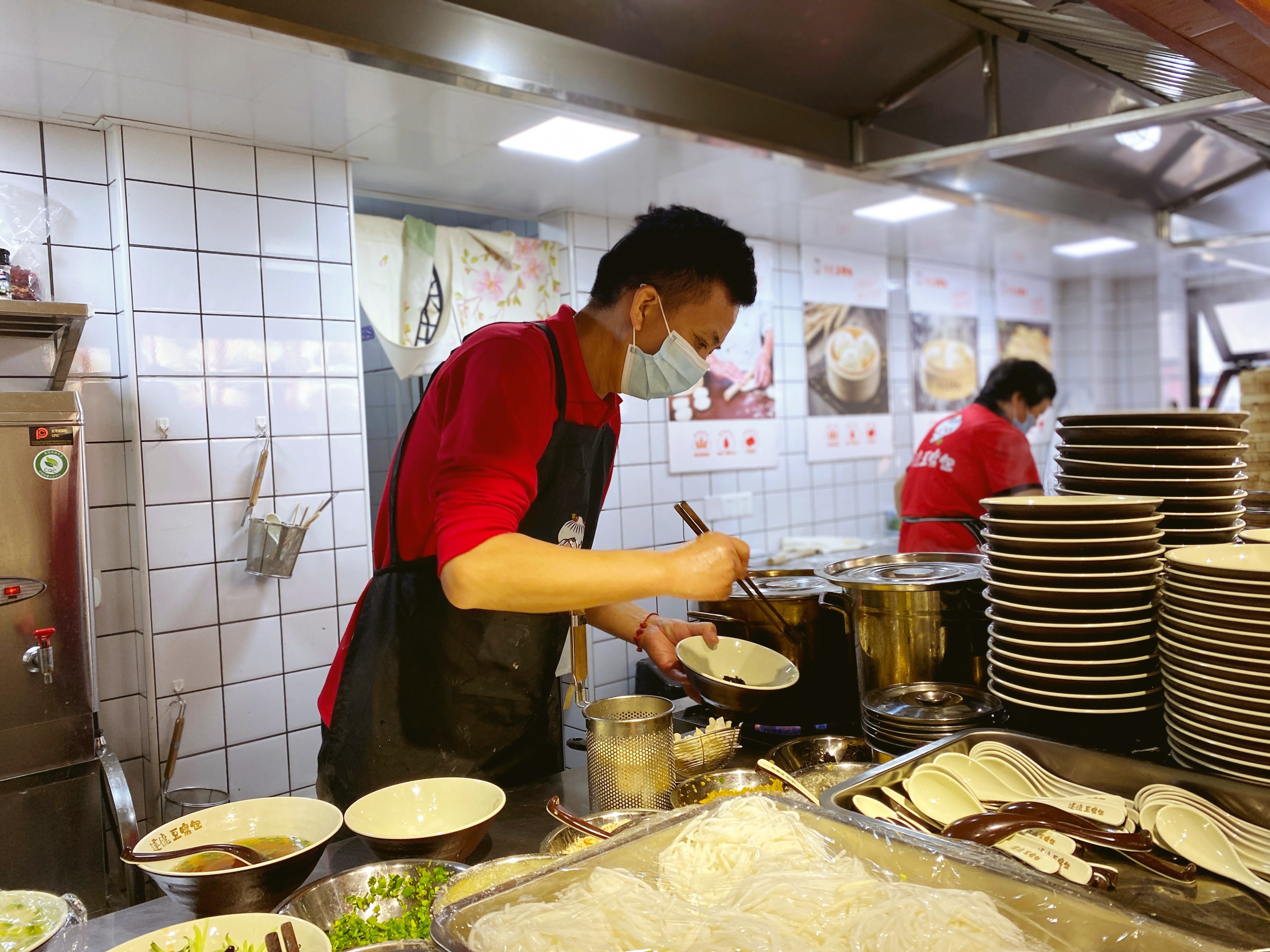 半开放式厨房,一逢豆腐包出锅,烟雾缭绕、热气腾腾。顾客可以全程看到豆腐包的制作过程,吃得舒心也更放心。