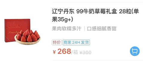 记者查询了各大生鲜平台,发现在盒马APP上,来自辽宁丹东的99牛奶草莓1kg售价228元,平均一斤114元。个头稍大的单果35g+、28粒装礼盒,售价更高达268元一箱,平均一颗9.6元。值得注意的是,这还只是活动特价促销,商品原价为300元一箱,每粒草莓高达10.7元。