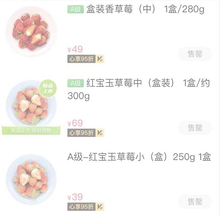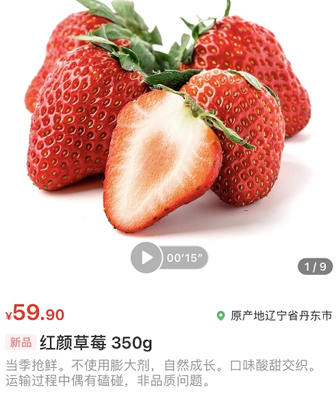 在每日优鲜APP,350g的丹东红颜售价59.9元,折合85.5元一斤;另外一款章姬草莓150g售价29.9,折合99.6元一斤。