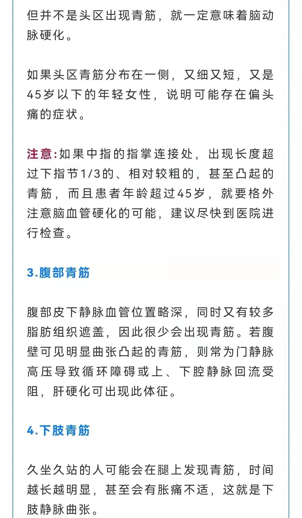 因此,应在平时留心自己身体各部分的青筋情况,若发现与往常略显不同时,就要加以关注,必要时就诊。