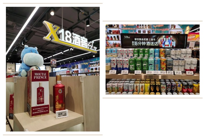 相比改造前的酒水区,“X18酒窖”区域的酒水摆放更集中、品类更多元。独家专供的白酒洋酒、市面上流行的小甜酒、来自全球知名葡萄酒庄的葡萄酒、盒马自己研发的酒品......市民都可在线下选购,同时门店支持最快18分钟送达服务,亲朋聚会都可“一键下单”。