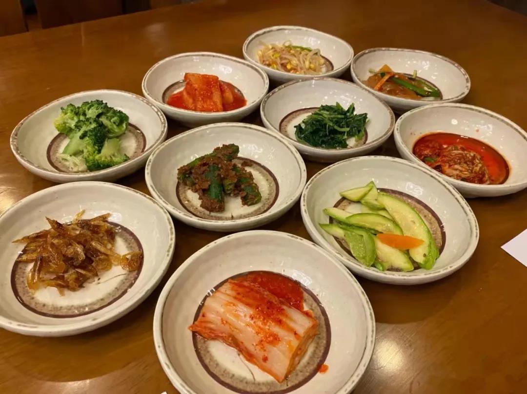 店里的菜单厚厚一大本,韩式烤肉、各种锅物、拌饭、面条,基本上你能想到的韩餐菜式这里都有。无论你点什么食物,都会先免费送上10碟小菜,辣泡菜、萝卜泡菜、白泡菜汤、水芹泡菜等,玲琅满目摆满一桌子,吃完了还能续加。不仅如此,店里每道菜的分量都很足,人均只要130元。