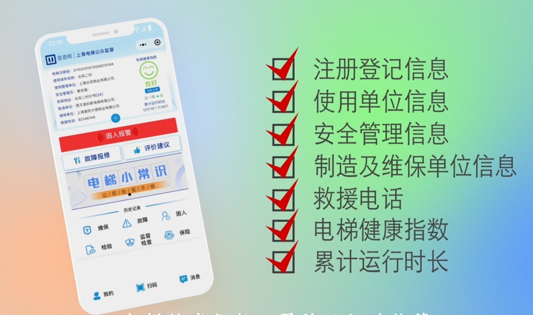 乘梯人通过微信扫描“上海智慧电梯码”,可实时获取电梯基础信息,并准确定位电梯地理位置,反馈电梯故障、困人等状况。维保单位的维保人员通过“上海电梯维保”微信小程序扫码可以获取电梯基本信息,并方便的进行电梯绑定、数据纠错、维保计划制定、维保作业、困人救援、紧急维修等工作。电梯使用单位扫码,能够获取电梯基本信息、通知公告、历史故障、历史困人、维保信息、检验信息,并可以进行电梯困人救援、故障报修、维保或修理的完工确认等。特种设备监管人员通过扫码可以获取监管人员关注的电梯基本情况、维保情况、使用管理情况、困人情况等信息,并进行与监管相关的操作。