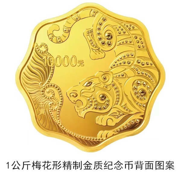 1公斤梅花形金质纪念币和30克梅花形银质纪念币背面图案均为装饰风格虎造型,衬以装饰纹样。