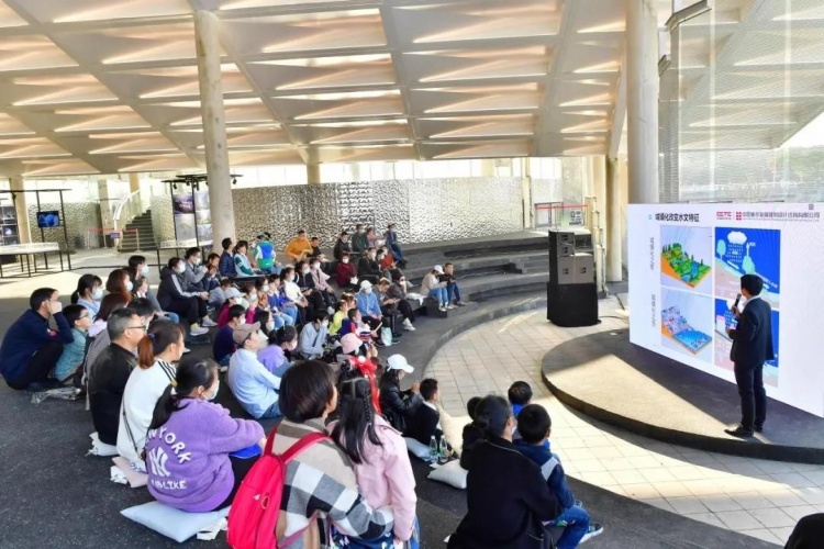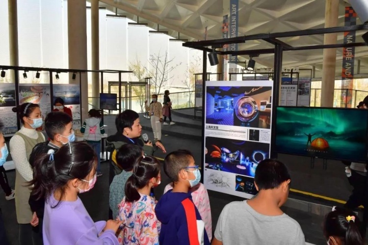 实地探索后,大家来到未来社区样本展位于纸飞机的主展厅。策展人为大家导览了“临港·生长”临港新片区2周年建设成果展。孩子们对星空之境海绵公园的模型产生了极大的兴趣,他们将自己一路探索所得的照片和展览里的模型一一对比,对海绵城市的理解更加深入。