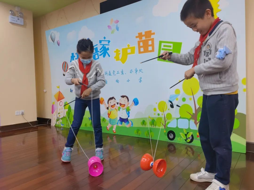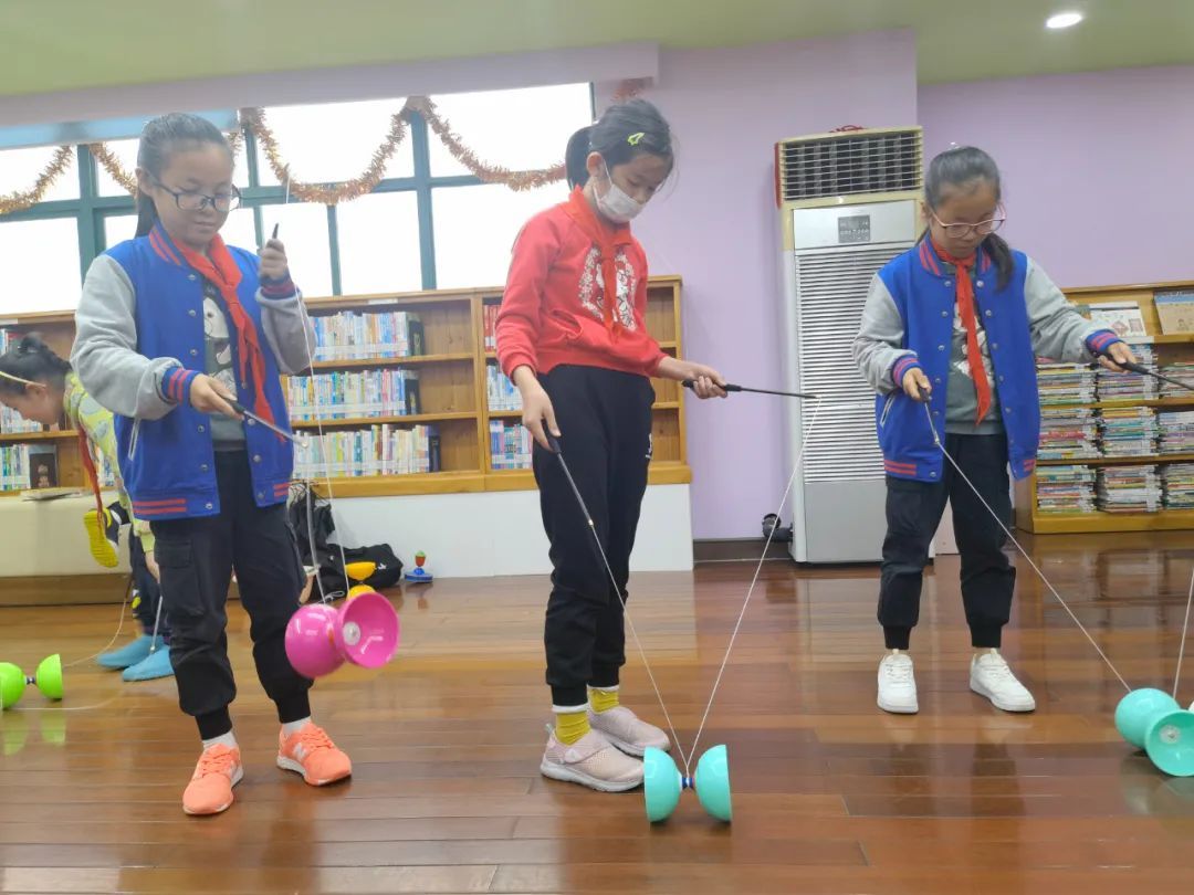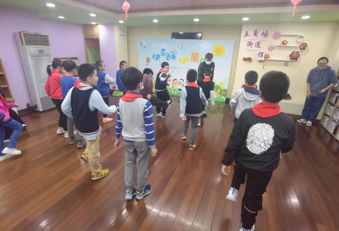 每周五下午三点,五角场小学(西部)都会安排教师带领着参与课后服务的学生们来到五角场街道图书馆,街道则会安排社区学校或体育学院的老师为学生们上课。抖空竹、跳健美操……在老师的带领下,学生们尽情舒展筋骨,放松身心。
