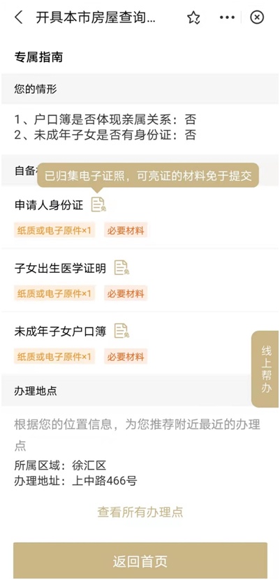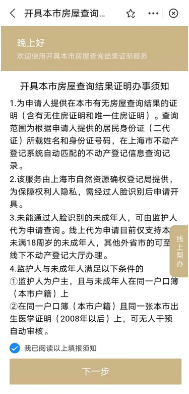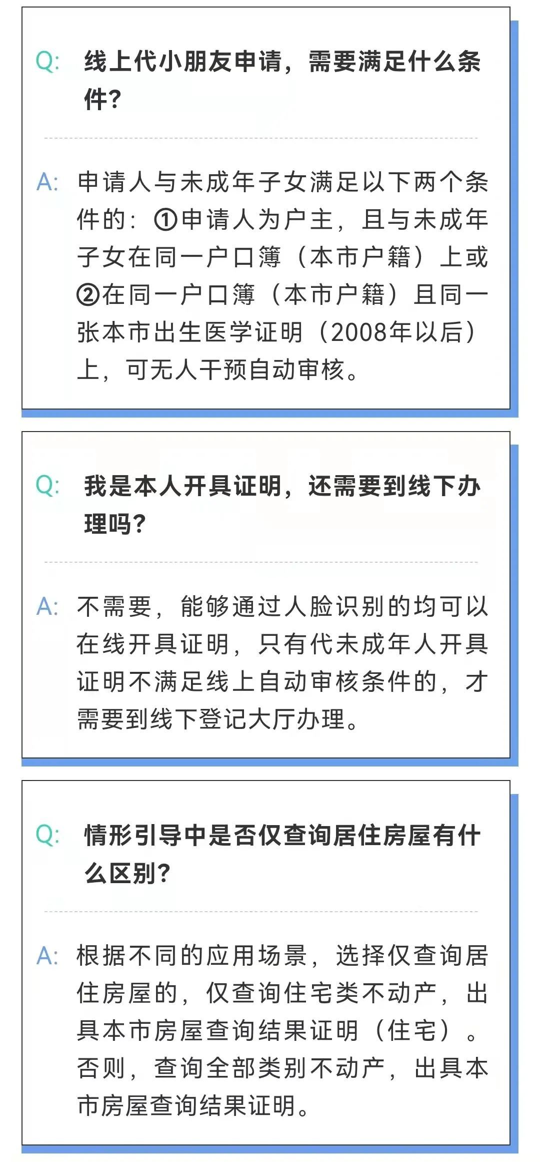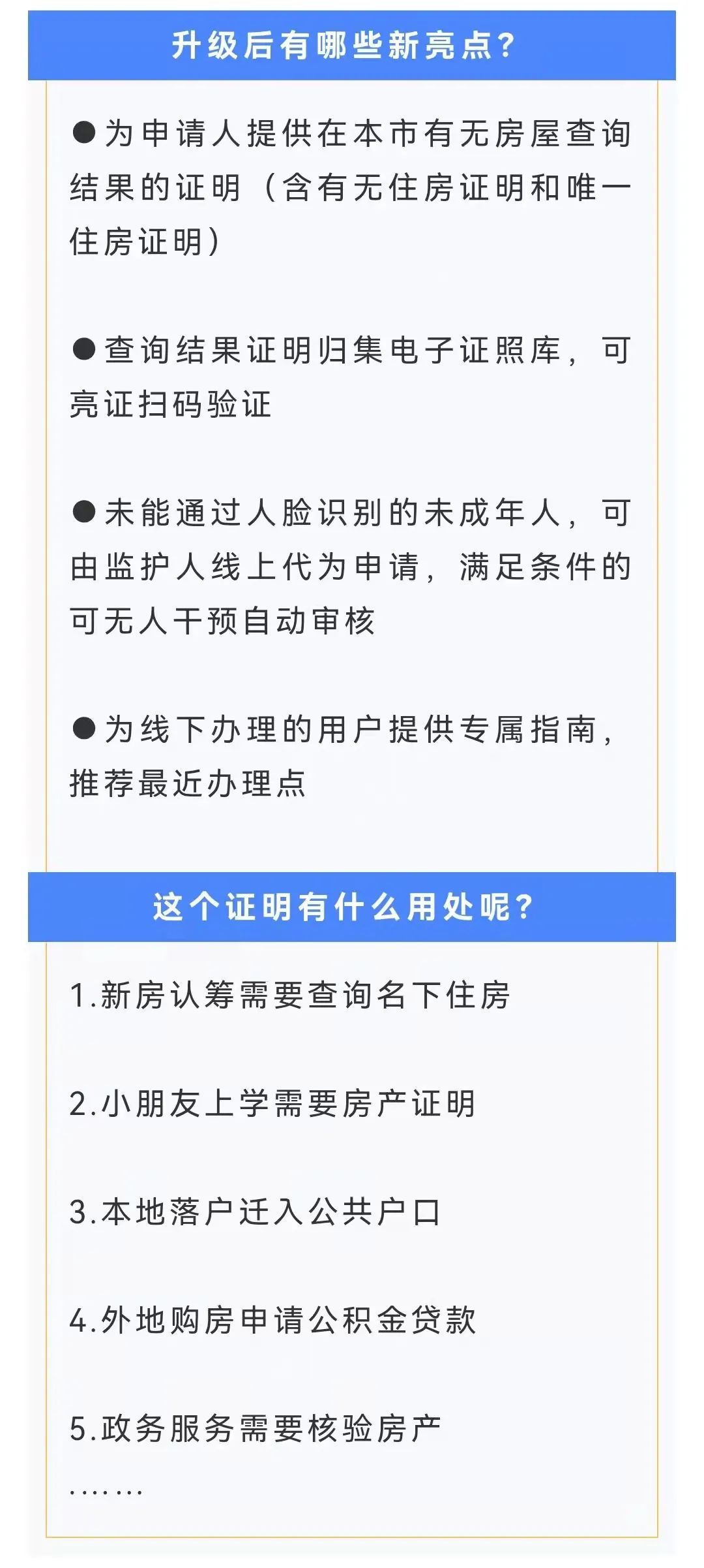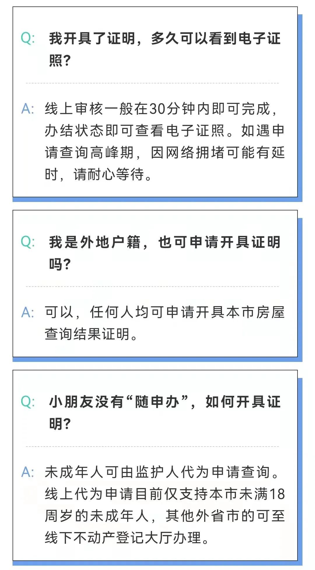 1、登录“随申办”APP、微信或支付宝的“随申办”小程序,搜索“我的不动产”,选择“开具本市房屋查询结果证明”;或在“亮证”—“在线开具证明”选择“开具本市房屋查询结果证明”。为保障数据安全,本应用需经过人脸识别认证后使用。