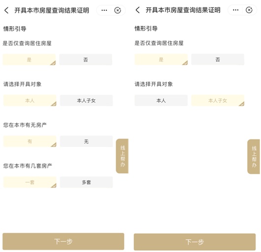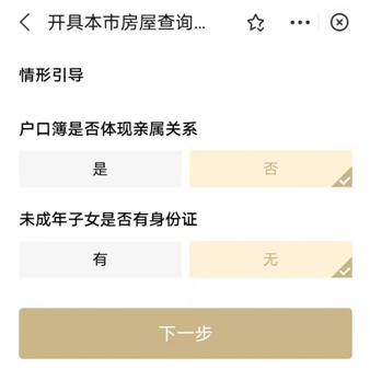 6、线下办理查询提供情形引导,用户可根据实际情况选择“户口簿是否体现亲属关系”(即申请人为户主且与子女在同一户口簿)、“未成年子女是否有身份证”,点击“下一步”后,根据用户选择提供专属办事指南。