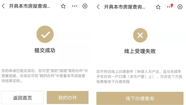 5、提交成功可点击“我的办件”查看办件进度;代未成年子女申请,不符合线上办理条件的,可点击“线下办理查询”查看线下办理方式。