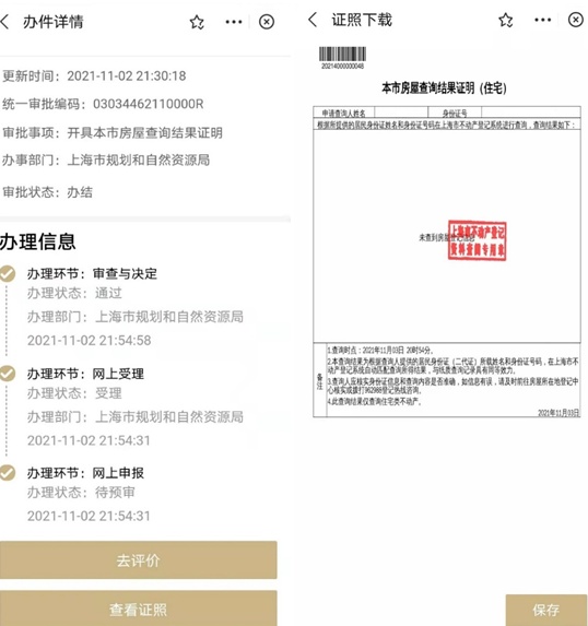 7、提交成功后,可在首页“我的”频道“我的办件”中查看“办件详情”,办结后可点击“查看证照”查看“本市房屋查询结果证明”电子证照的缩略图(可保存)。