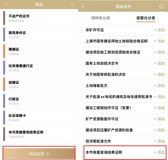 也可在“亮证”—“我的证照”—“个人”点击“添加证照”,在“市规划资源局”目录下找到“本市房屋查询结果证明”,添加后即可扫码亮证使用。