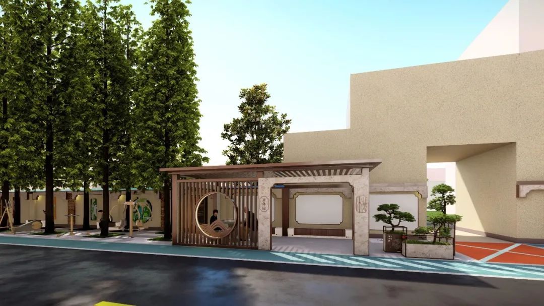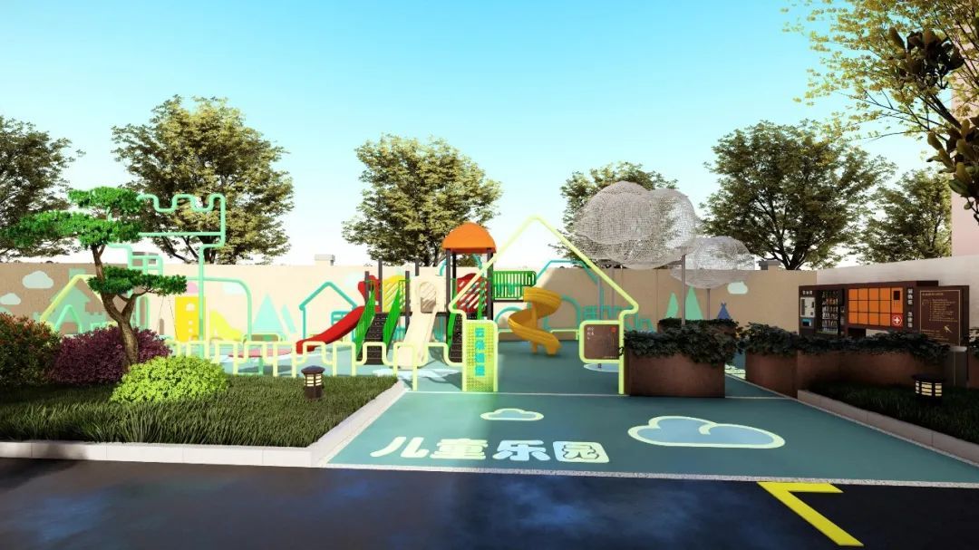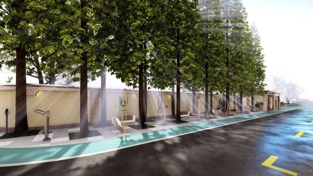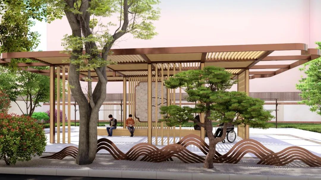 “天气晚来秋”中的“秋”意指秋天,也有晚年的含义。设计师引入此概念打造一处颐养康体、和乐延年的健身场所。为了营造全年龄段的宜居乐园,健身场地不仅配备了各种活动设施,更有时兴的夜光跑道,还规划设计了可供休憩的松月亭,能满足各种人群的休闲活动需求。