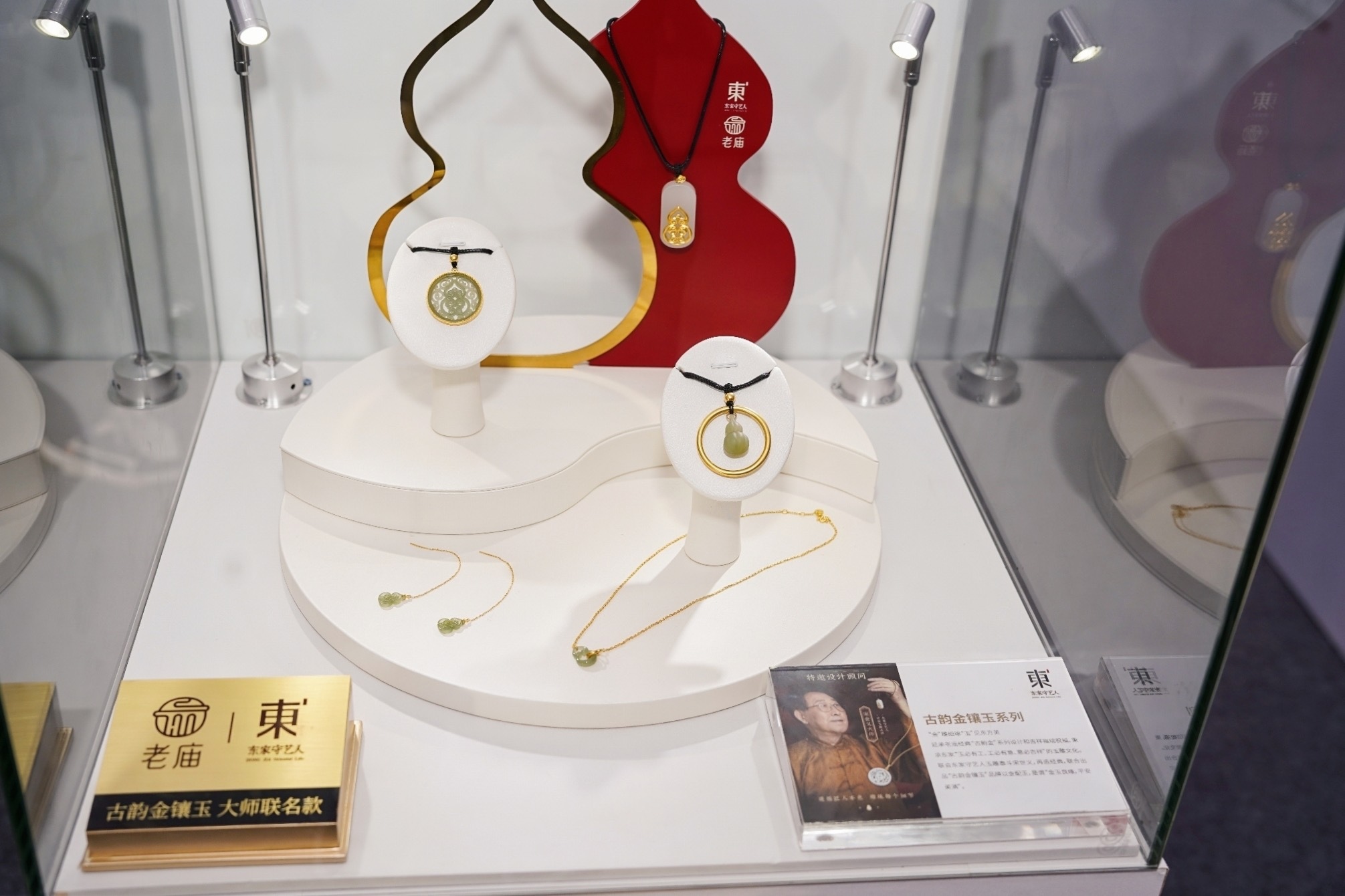 “东家守艺人”团队针对市场痛点,对产品进行打磨与升级:延承老庙经典“古韵金”系列设计和吉祥福瑞祝福,秉承东家“玉必有工、工必有意、意必吉祥”的玉雕文化,联合中国工艺美术大师、中国玉雕大师、国家级非物质文化遗产玉雕传承人宋世义,根据年轻消费者需求设计古法金+和田玉的日常佩戴首饰,主打葫芦、莲花、竹子等美好寓意,推出“古韵金镶玉系列”产品——再造经典,以金配玉,是谓“金玉良缘,平安美满”。