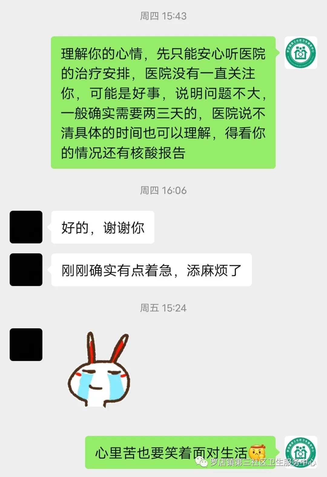 面对陌生的环境,每个人或多或少都有些焦虑和情绪,人员安抚已成为医务人员的日常工作,工作微信化身为医务人员与隔离人员沟通的桥梁与热线,“总是去安慰”变身为屡试不爽的“灵丹妙药”。已是下午15:43分,刚忙完手上工作的医务人员,还没来得及吃上一口午饭,工作群中一条不安的信息传过来,她赶紧拿起手机进行安抚,“理解你的心情,医院没有关注你,可能是好事,说明问题不大,心里苦也要笑着面对生活,多喝水、吃点水果,有任何不适及时联系我们”。