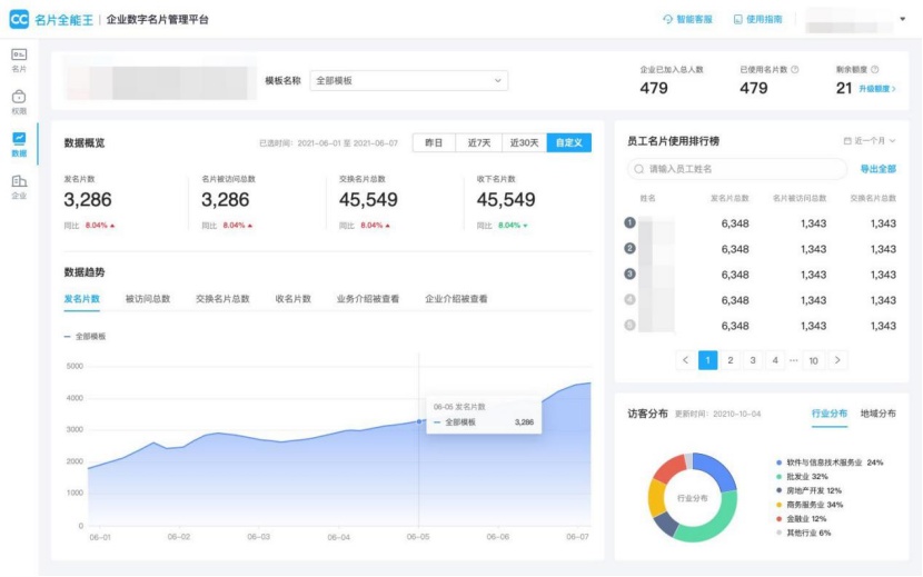 据悉,“数据看板”还可以帮助管理者通过“员工名片使用排行榜”功能,更好地推动内部使用企业数字名片管理平台,而通过查看名片客户的“访客分析”,管理者可以知晓目前业务在哪些区域、行业的关注程度如何,有助于快速做出更加符合当前市场现状的业务决策。