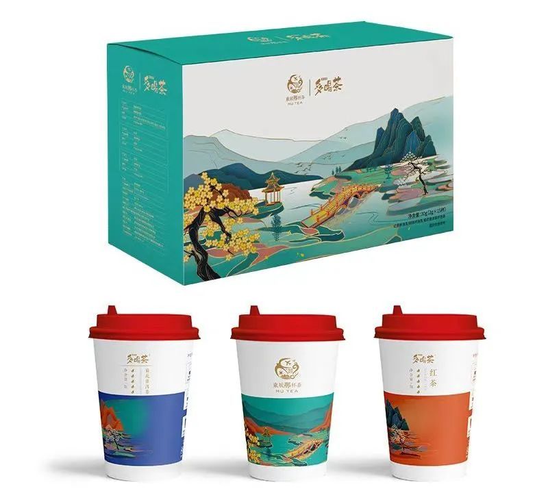 江山入画系列包装设计的主题风格同样采取了国风设计元素,主题画面以连绵不断的山水风景为主。不同的茶叶种类以不同的背景底色相互呼应,提高识别度,杯盖上的团花和杯体的团花相互映照,强化品牌特色。整体设计风格清新淡雅,富有传统韵味,同时彰显端庄大气。