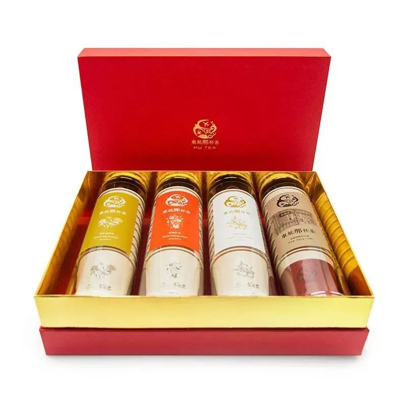 拉佤布傣联名款滇红茶、金银花陈皮白茶、菊花普洱茶、拉佤布傣联名款普洱茶,四种茶饮,整体包装素雅,宣纸色为底,墨色素描轻轻勾过,纸杯杯身淡雅,与包装彩绘完美融合。