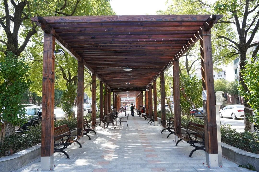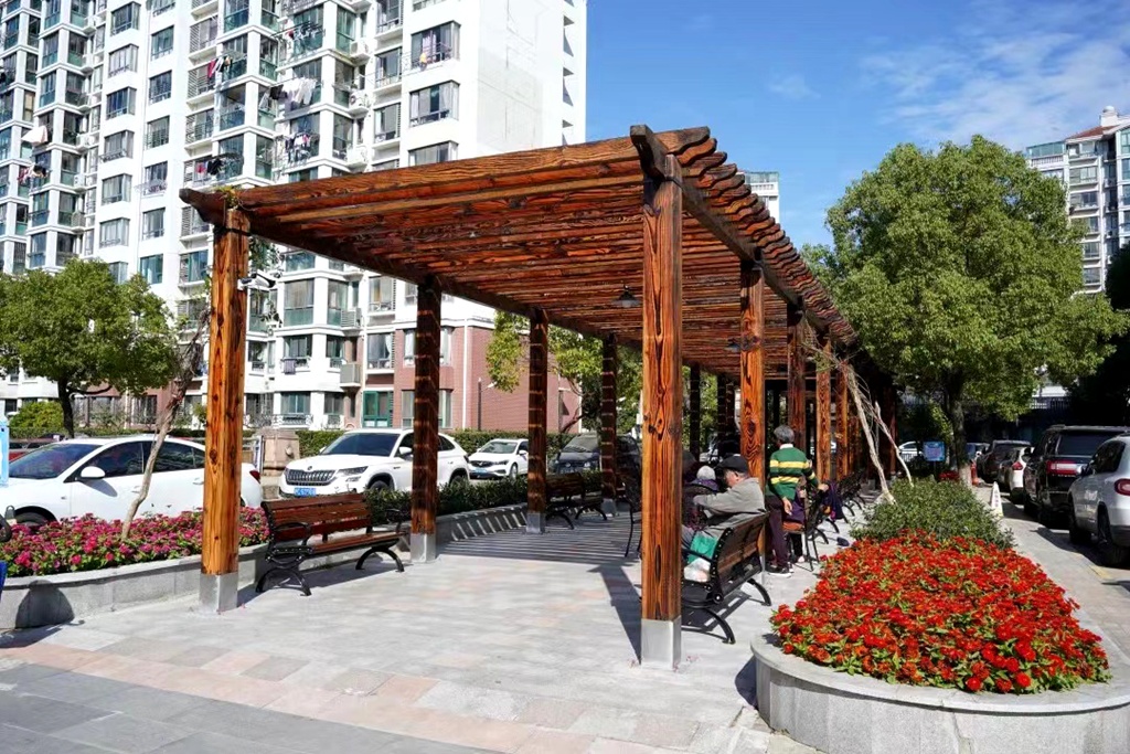 最终,经过一个多月的施工,古风木质长廊“闪亮登场”。长廊顶部安装上钢化玻璃,用于挡雨和遮阳,并将花坛原本简单的水泥结构改造成木质钢架结构,更牢固、更安全。