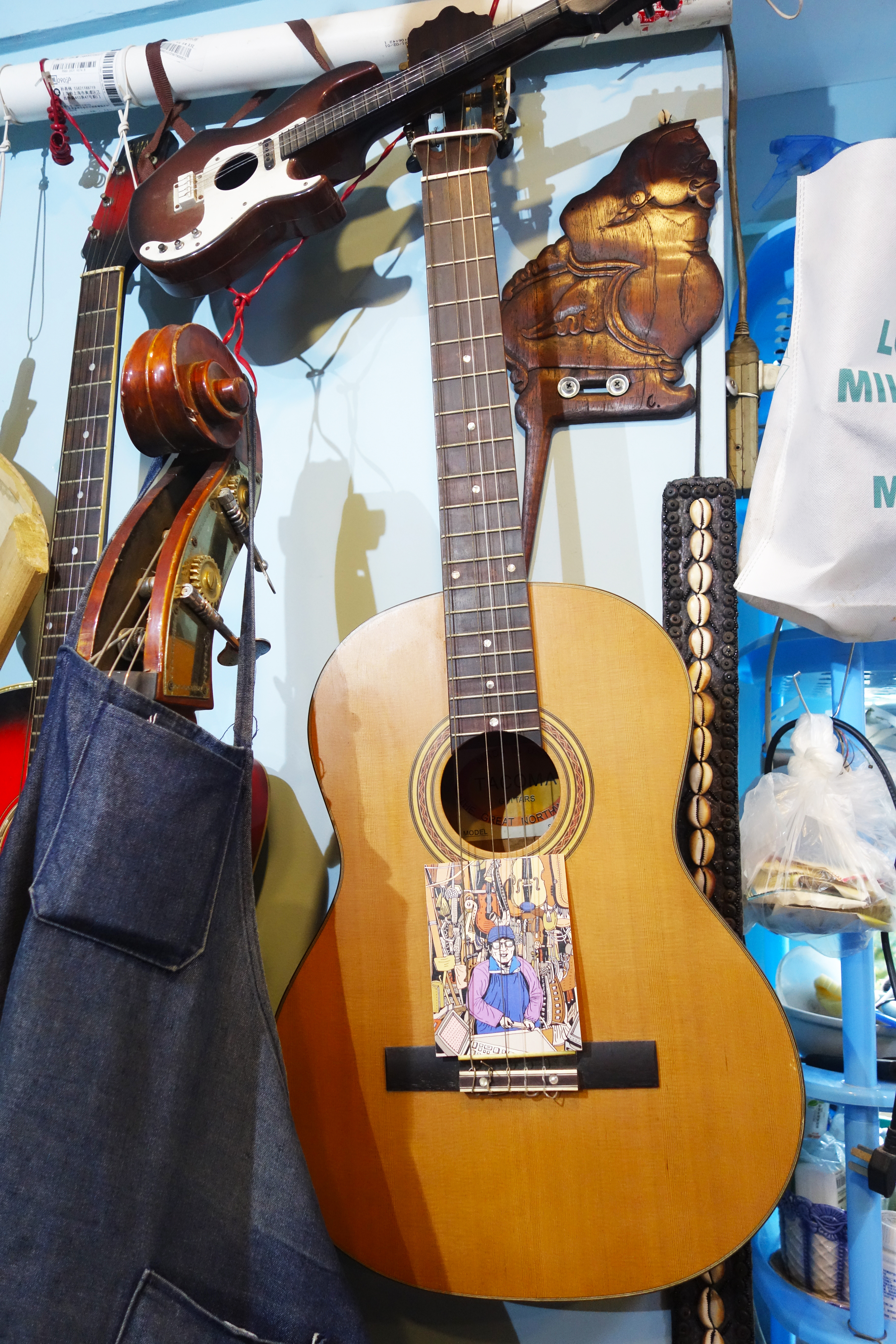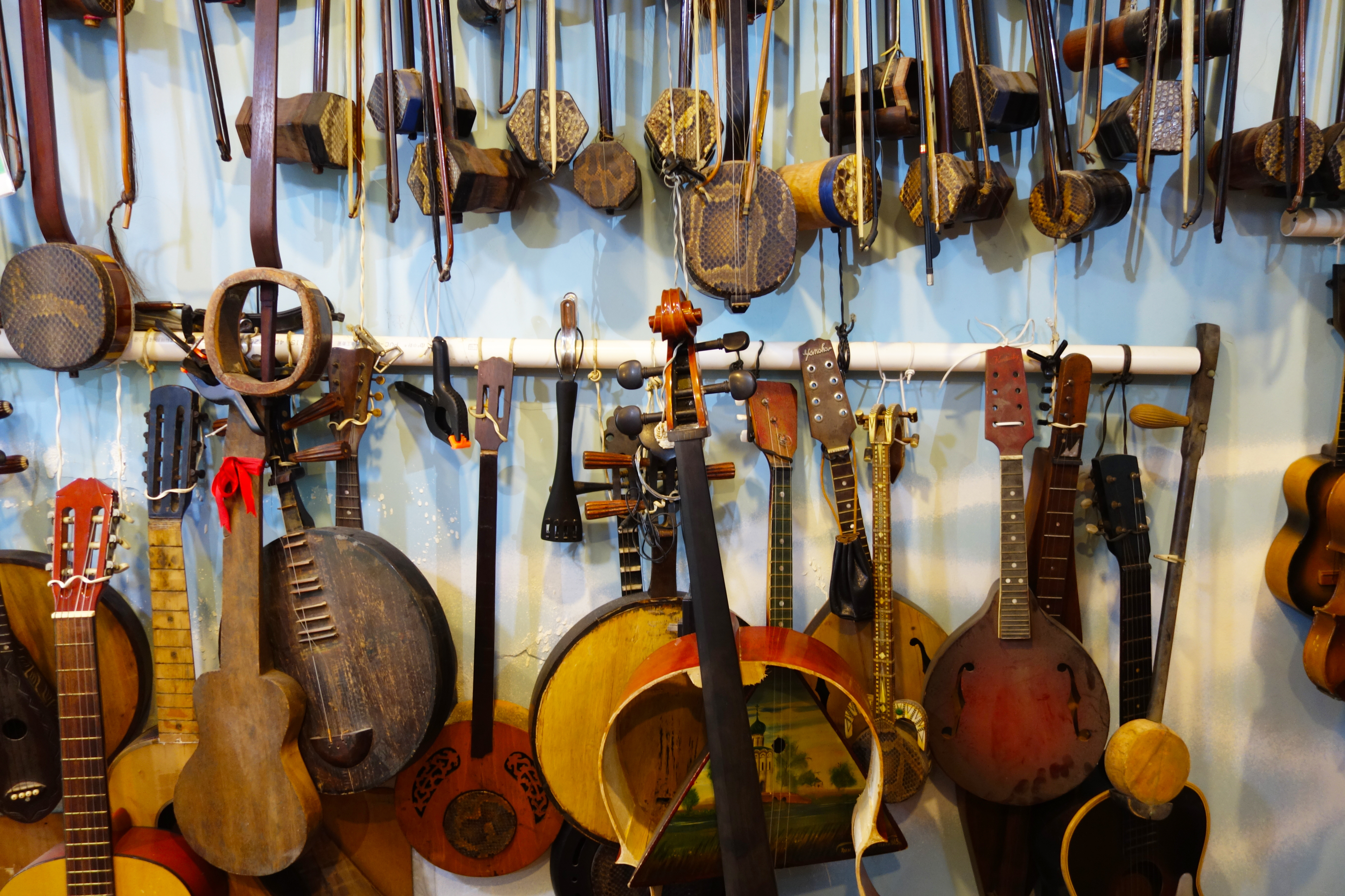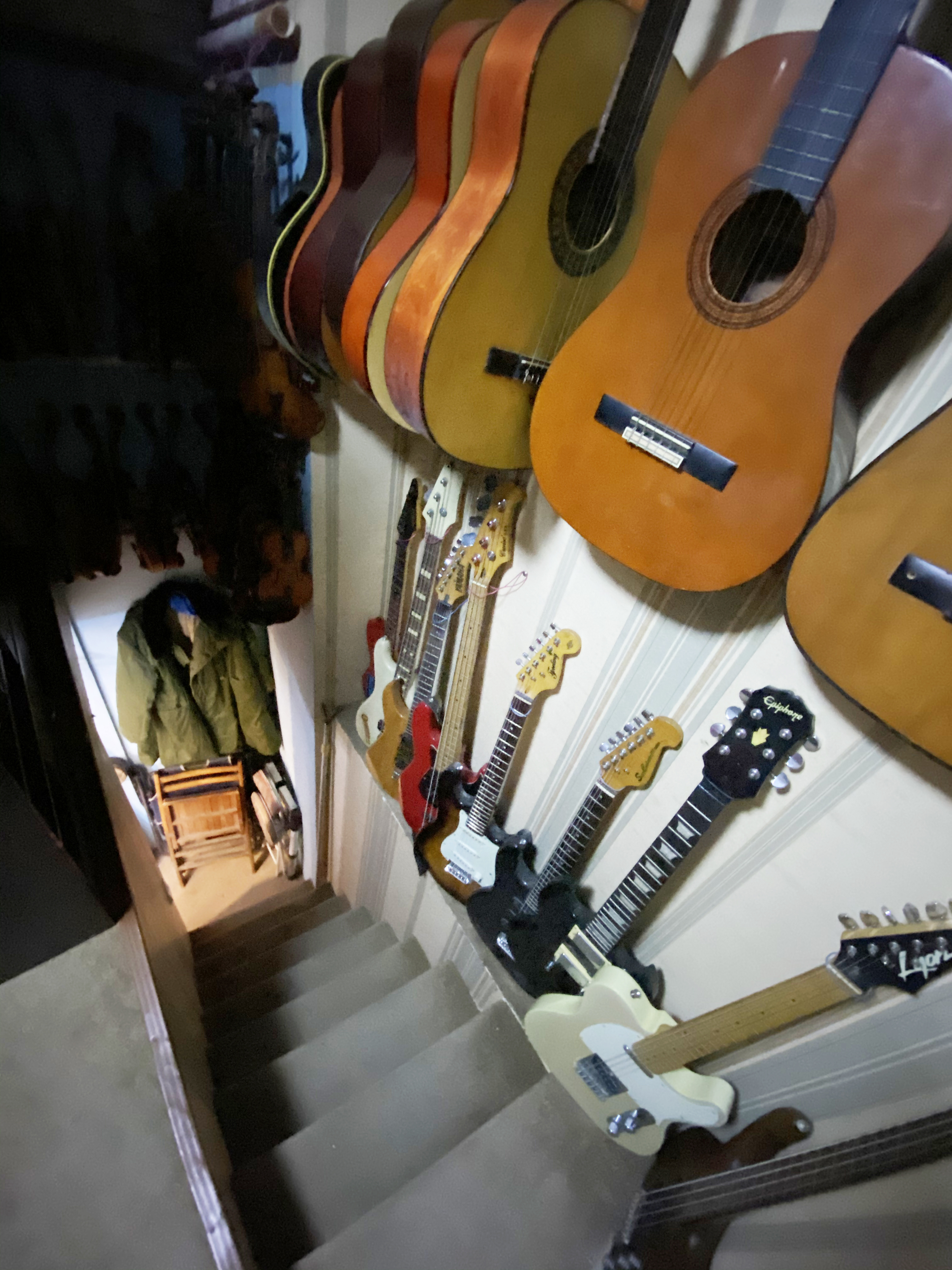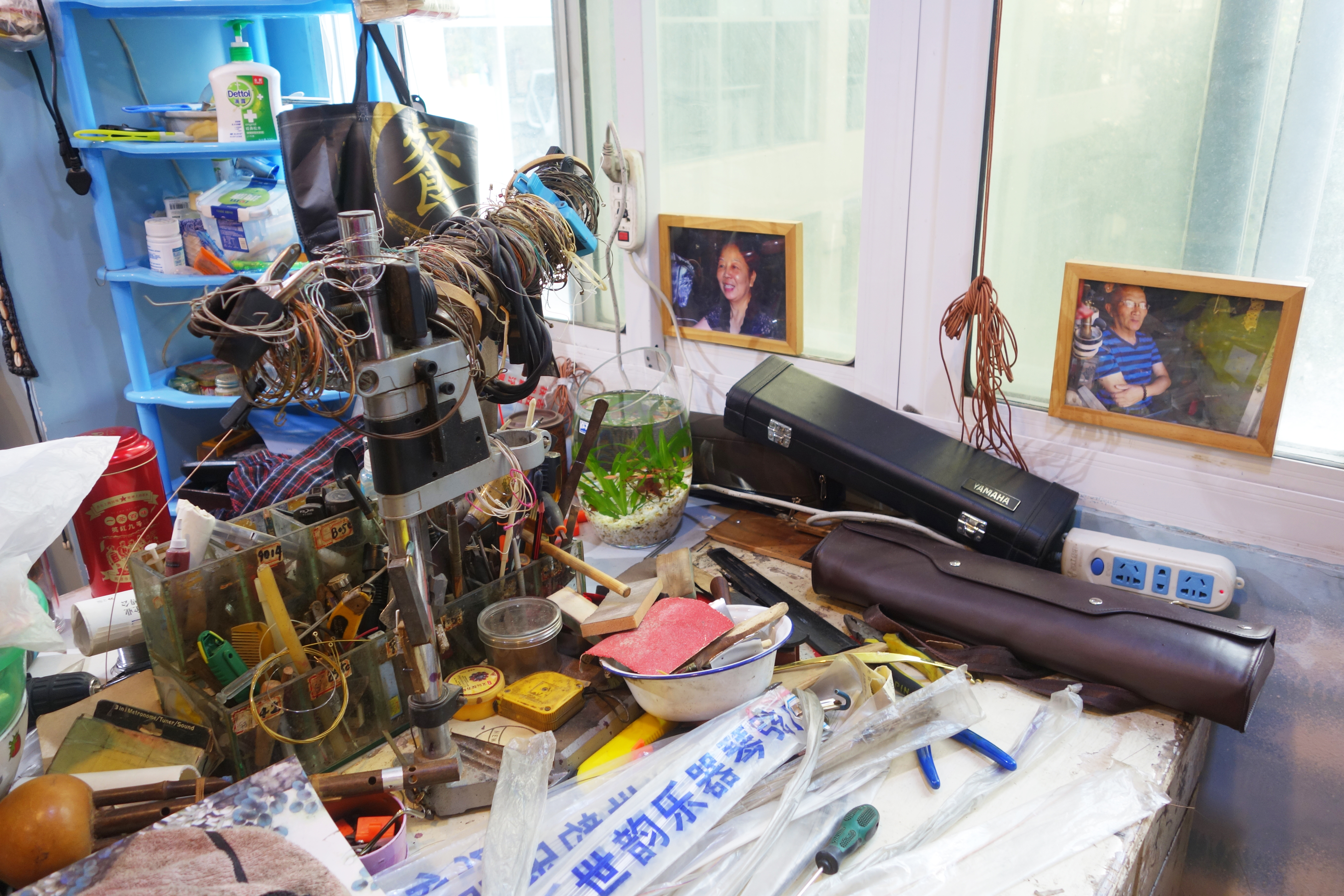 离开了肇周路的破旧小屋后,“小广东”冯顺成这次的新店足足有三层楼,一共38平米。上下依旧堆满了来自全世界的各种乐器,几乎每个角落都是乐器和维修工具。地方虽然变大了,冯顺成对乐器维修的专注和热情依旧不变。