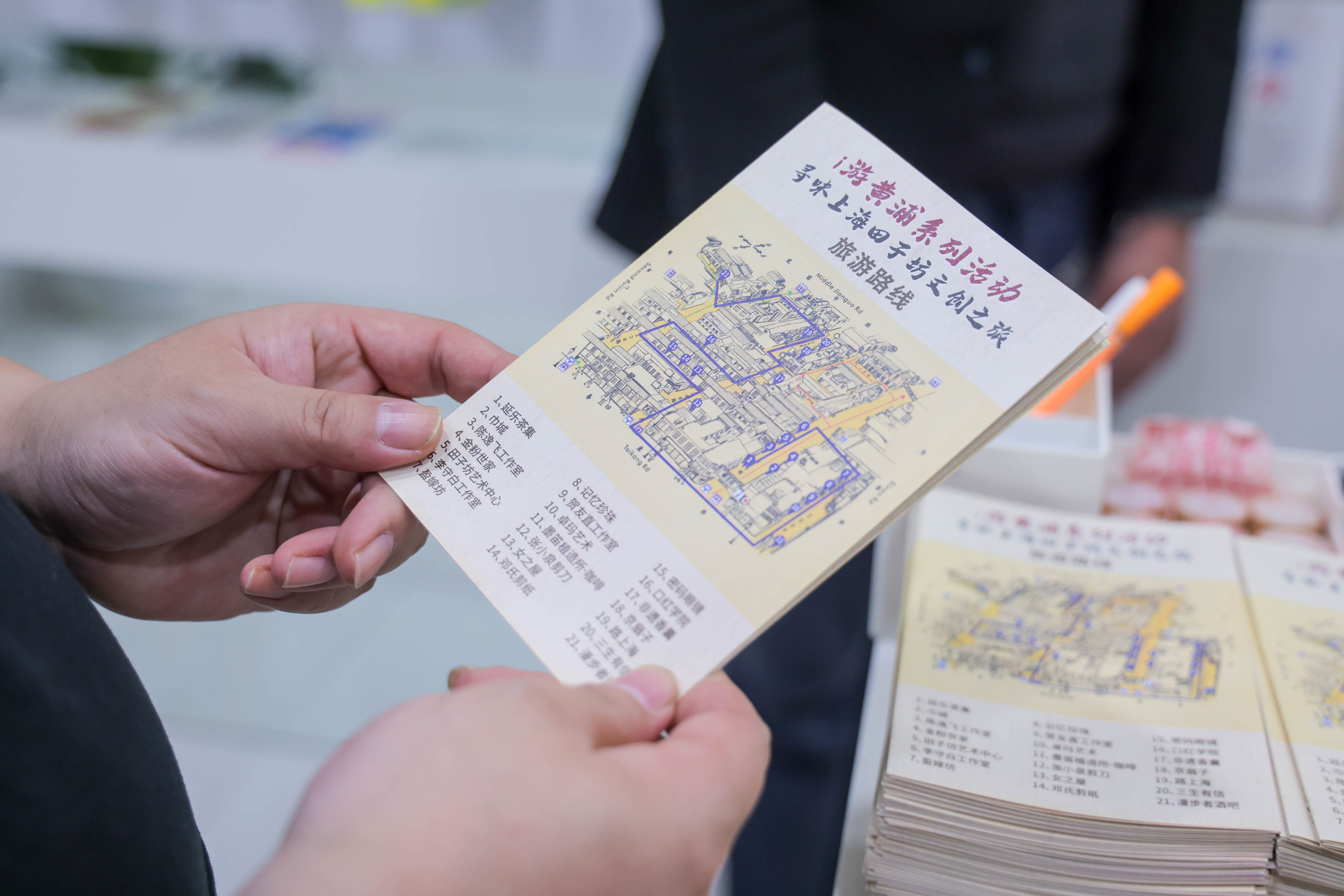 线路图内,既有贺友直、李守白等知名画家、艺术家的工作室,有田子坊艺术中心这样的公共艺术展示空间,更有众多富有上海魅力的特色小店。比如对传统文化的传承与坚守的守艺人——邓氏父子的剪纸店,守着一家小店,一辈子只做一件事,还如设计出一张“上海名片”的原创T恤店———路上海,以及中国扇文化为载体的小店——京扇子等十多家优秀的田子坊实体店。