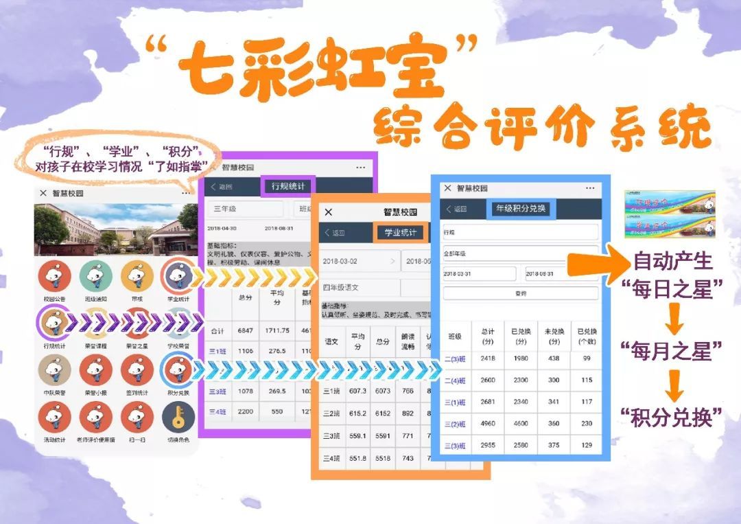2016年,宝虹小学引进了物联网智慧校园电子化评价系统,融合学业行规评价体系,经过了两年的时间设计完成了“七彩虹宝综合评价系统”,结合手机APP与电子班牌实现每日一评。