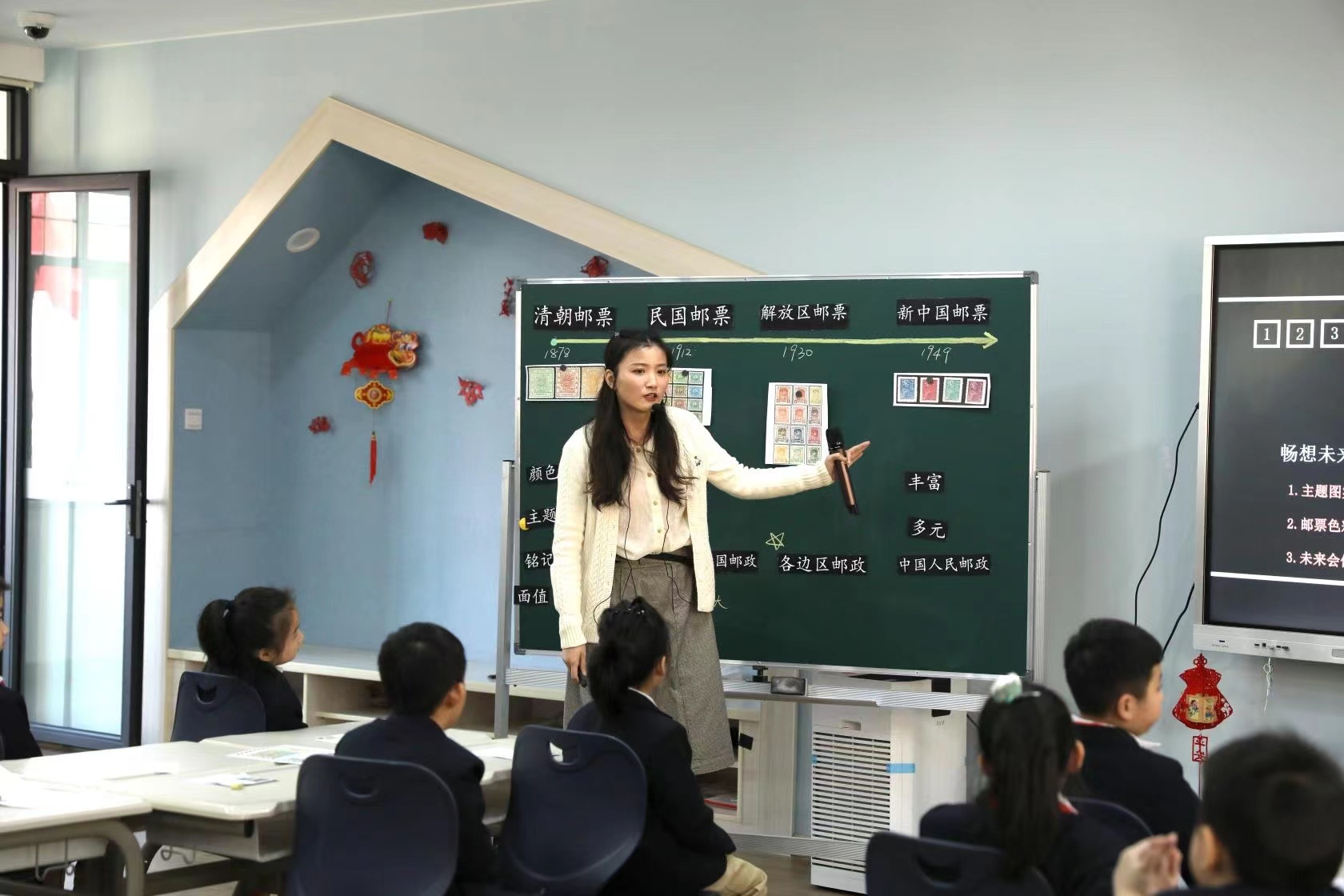 “给你一张邮票,你能鉴别和判断这是哪个年代的邮票吗?” 在三年级“少年邮局”课程中,陈倩老师抛出问题后,学生分小组展开讨论,调动起历史、人文、美术等知识,尝试找到这一颇具挑战性的跨学科学习问题的答案。