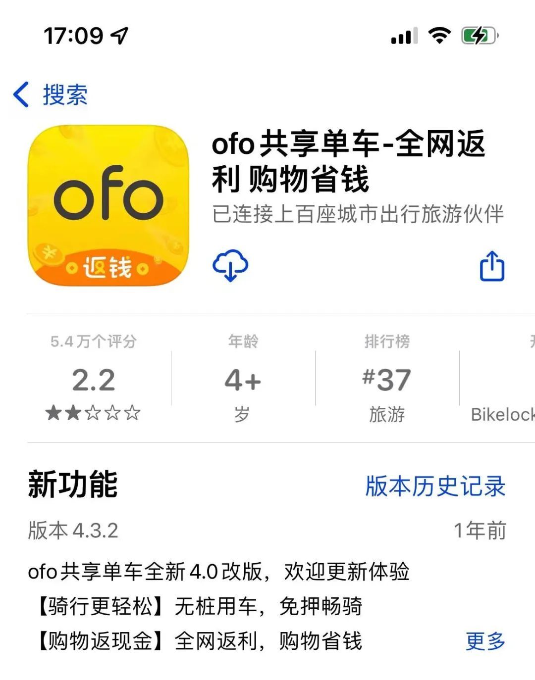 据苹果APP Store,ofo共享单车APP目前简介显示为“全网返利,购物省钱”,图标也直接带上了“返钱”的字样。