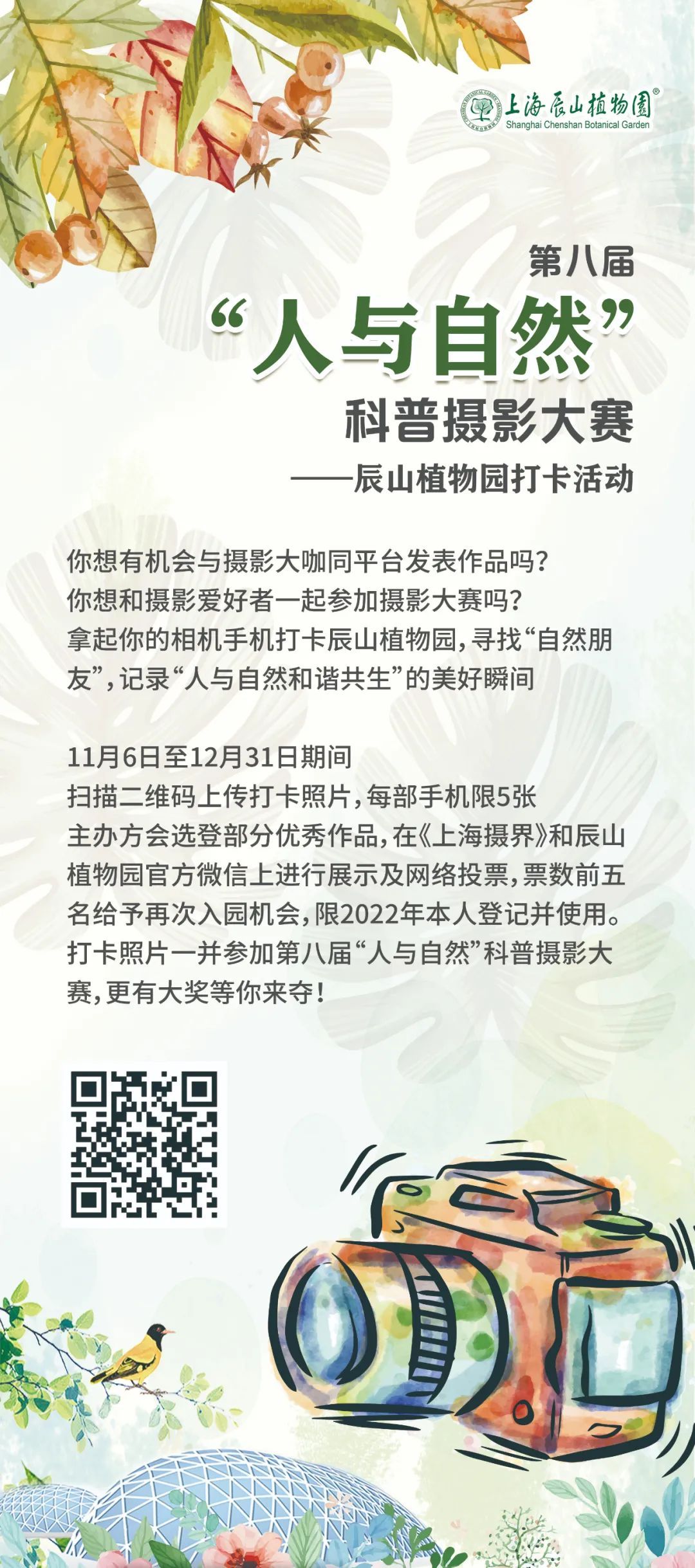 由辰山植物园,《上海摄界》结合第八届“人与自然”科普摄影大赛组织的辰山植物园摄影采风活动网络评选今天开始第一轮作品网络投票,票数前五名给予再次入园机会,当年内仅限本人登记并使用,第一轮作品评选截至日期2021年12月5日。