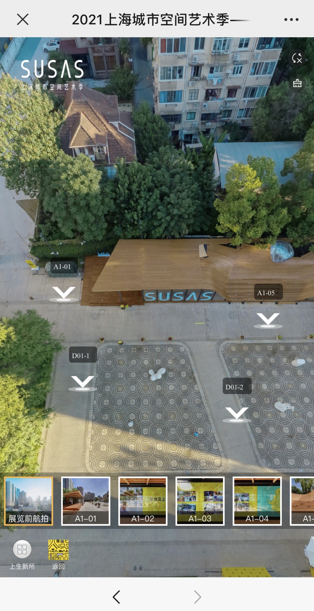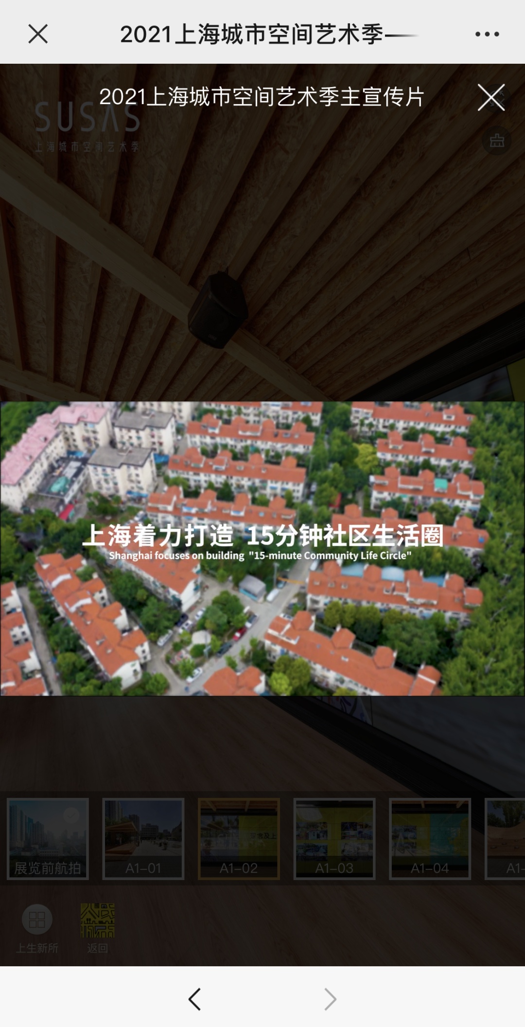 STEP2:可选择点击“主题演绎”“新华社区”“曹杨社区”“更多…(其他社区)”进入360度实景观展。还可点击“SUSAS官网”查阅展览资料,下载导览手册和导览地图。