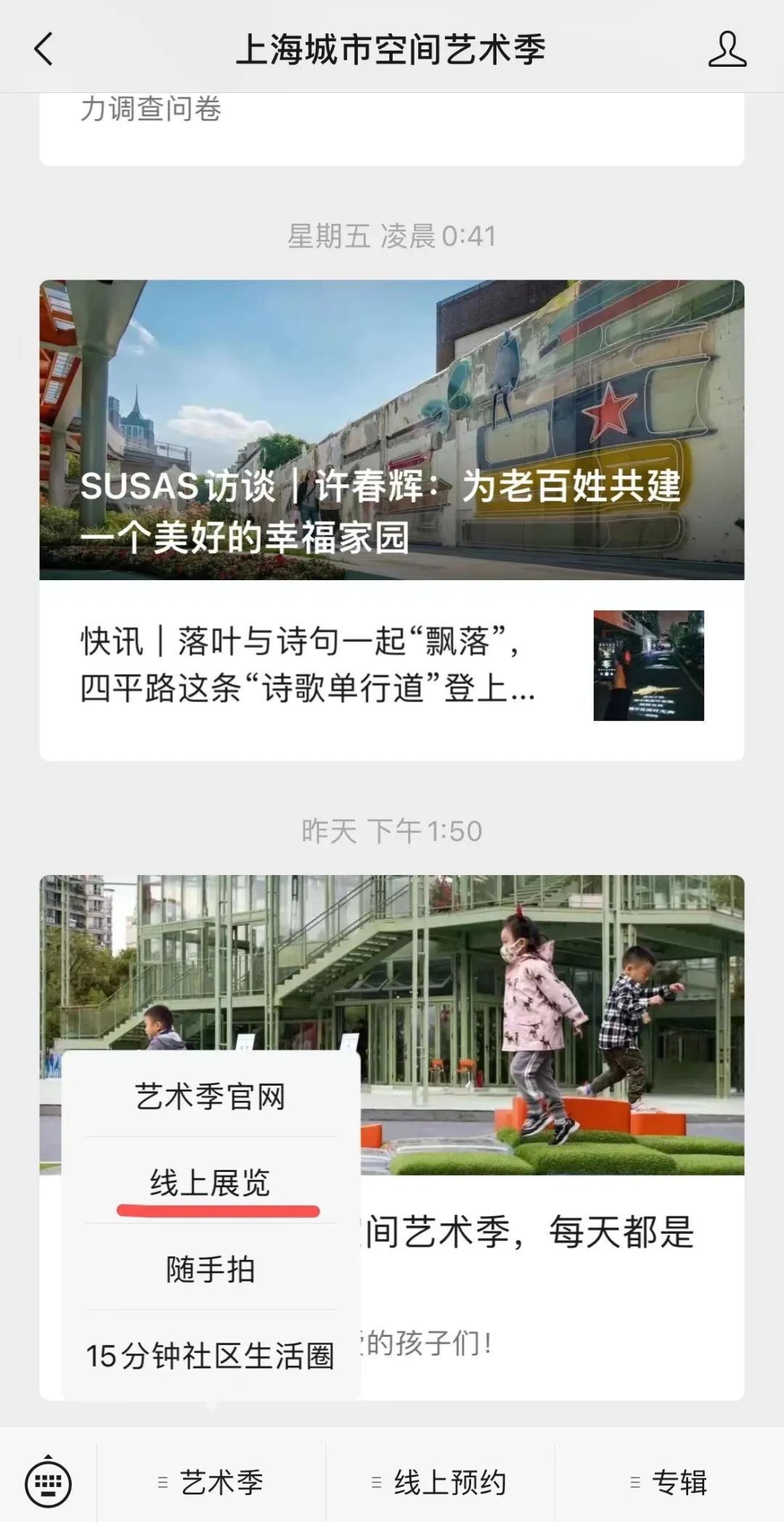 STEP1:登陆微信公众号,下部菜单“艺术季”中点击“线上展览”。