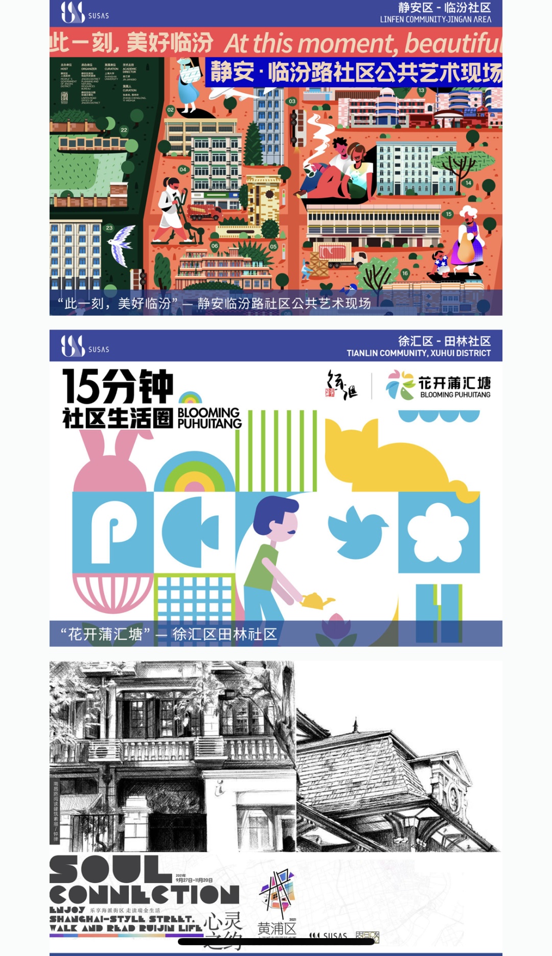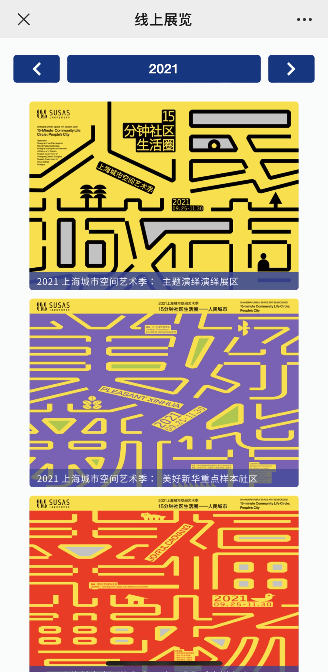 STEP2:“线上展览”菜单显示演绎展区和新华、曹杨等20个样本社区,可选择任意一张海报点击进入。您也可以点击左右箭头,查阅2015、2017、2019前三届空间艺术季的精彩内容。