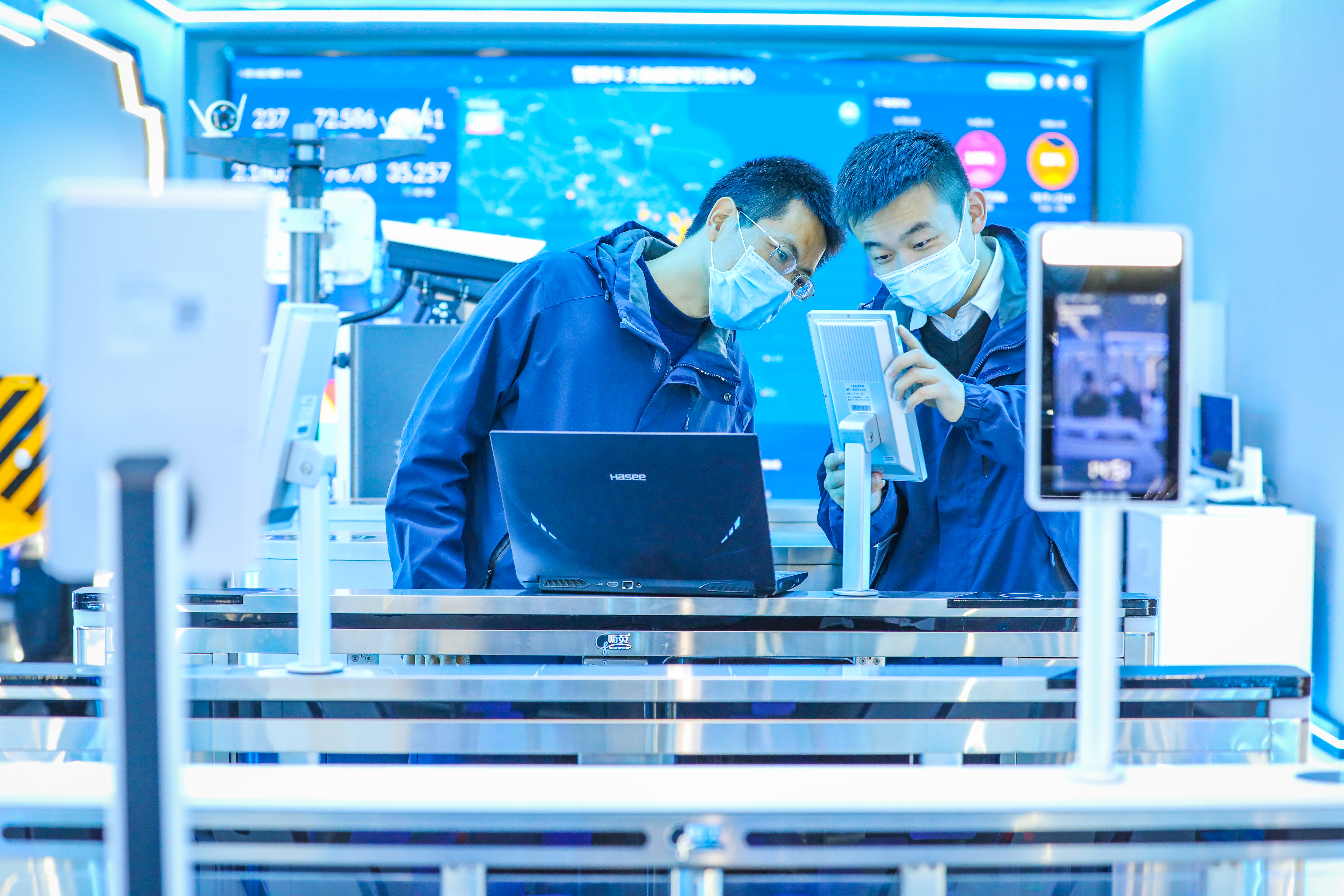 11月22日,位于松江经济开发区的上海畅荧智能科技有限公司的智能化车间里,工程师们正在对人脸识别通道系统进行调试。